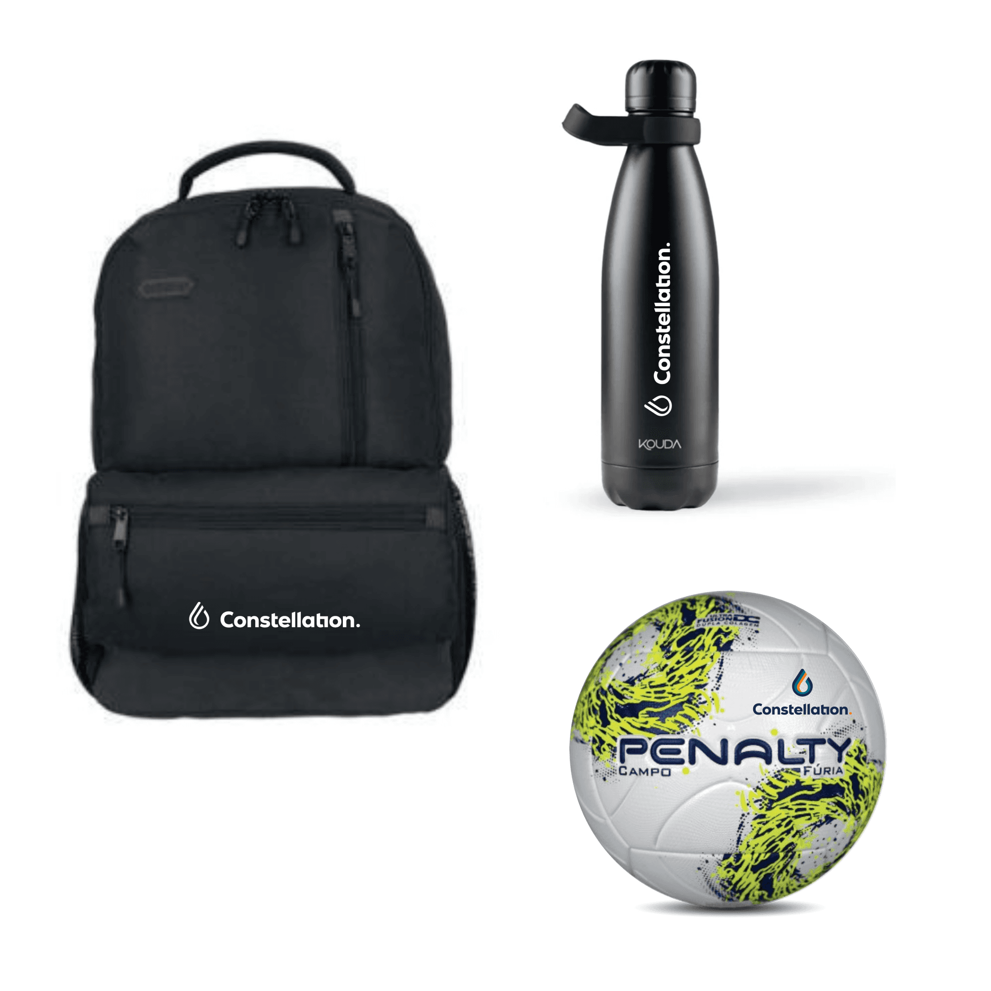 O kit é composto por uma Mochila American Tourister by Samsonite, Bola de futebol Penalty e Garrafa Kouda Grey.