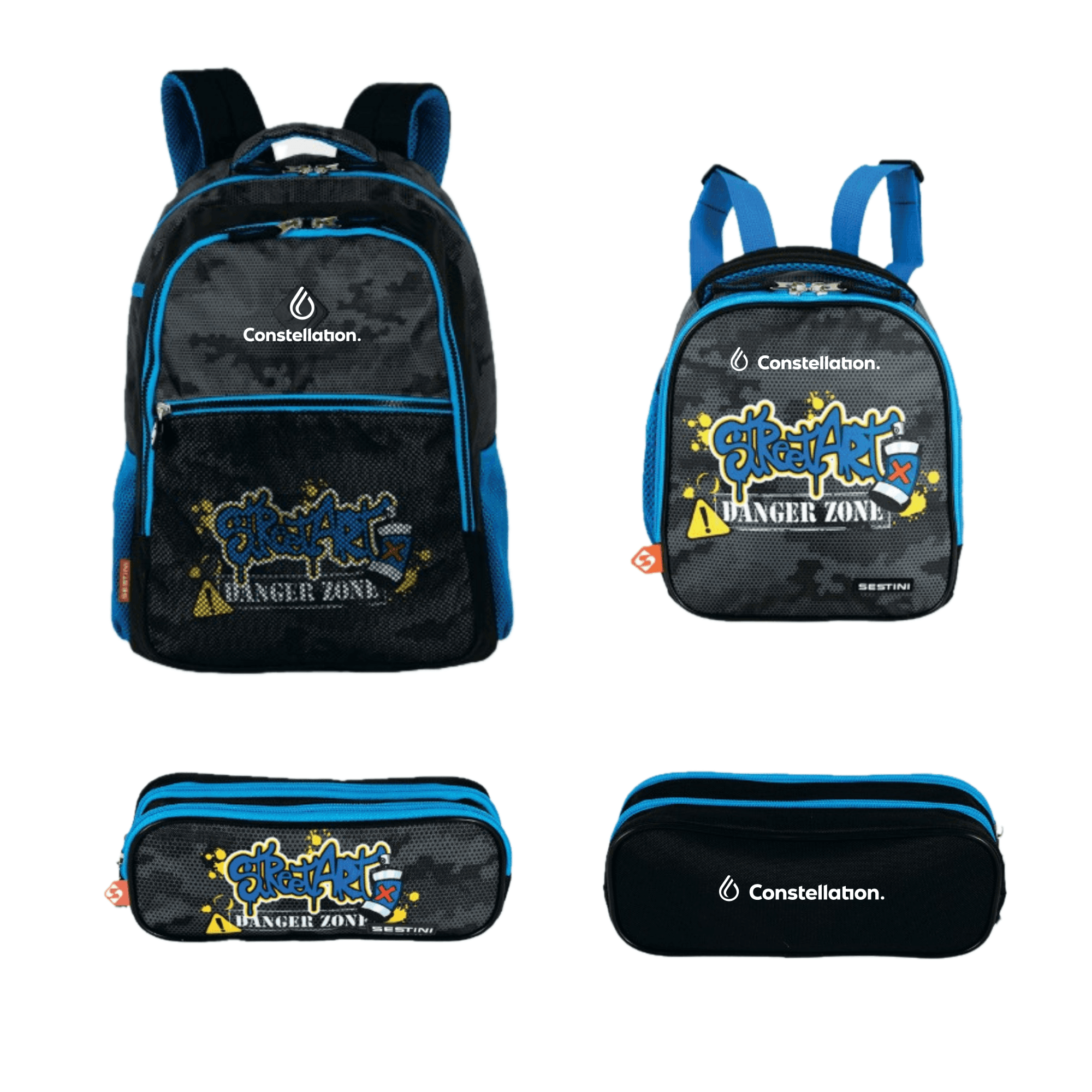 The kit consists of a Sestini Grafitti Backpack, a Sestini Grafitti Lunchbox, and a Sestini Grafitti Pencil Case with 2 Compartments.