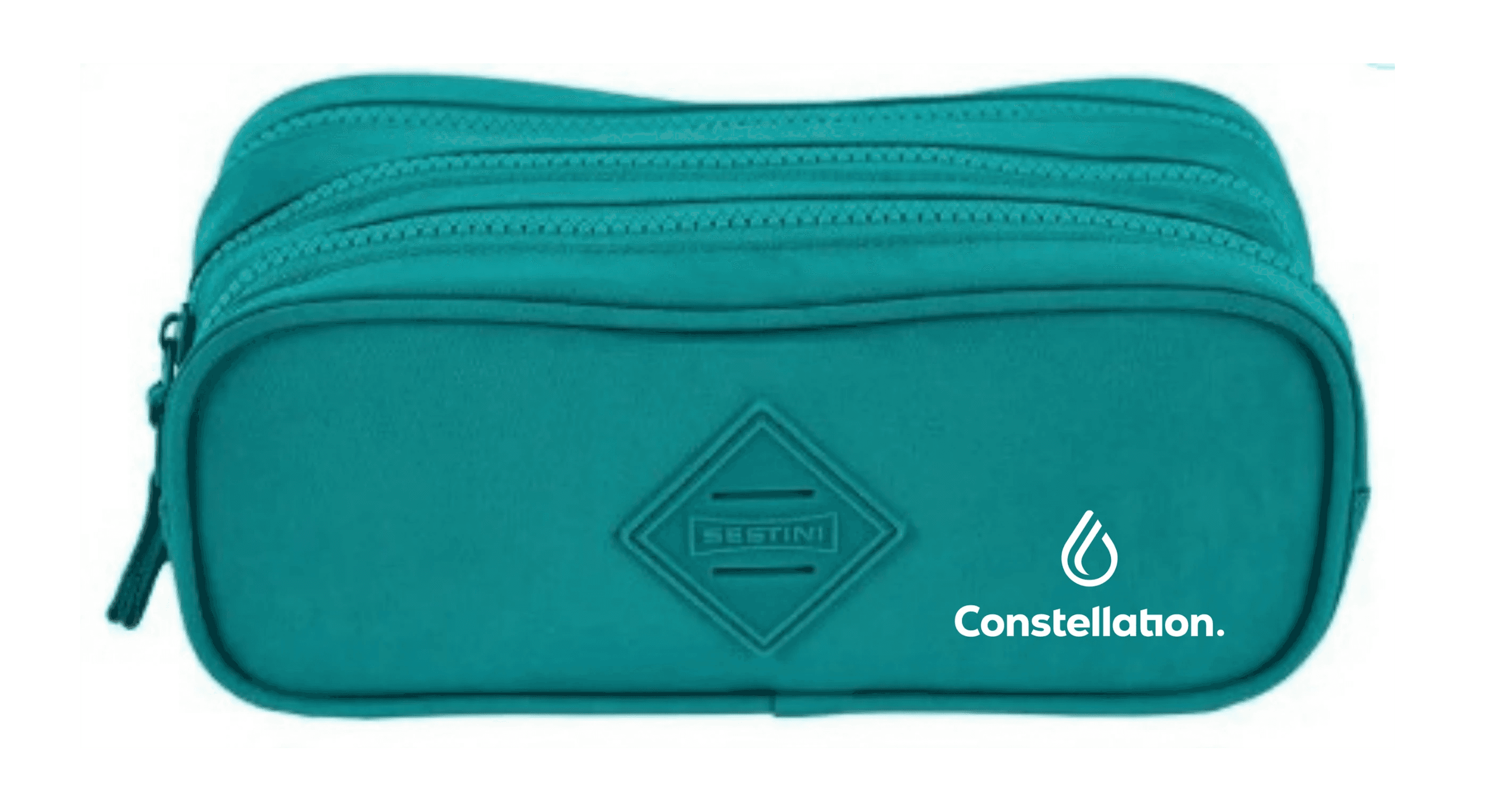 The Crinkle Green - Jade 3 Compartment Case has a zipper closure, 3 compartments, rubber logo, and a rectangular shape.