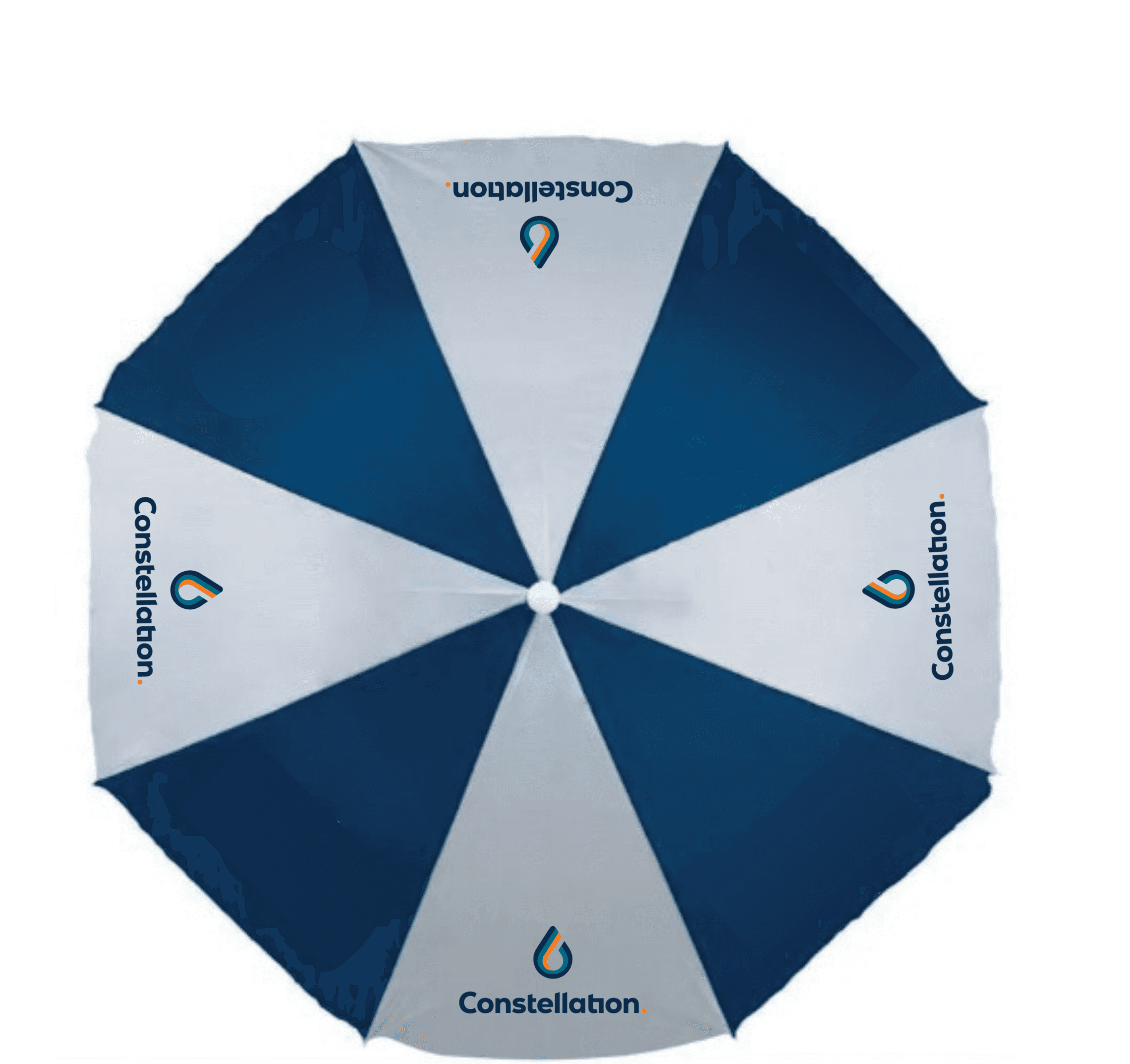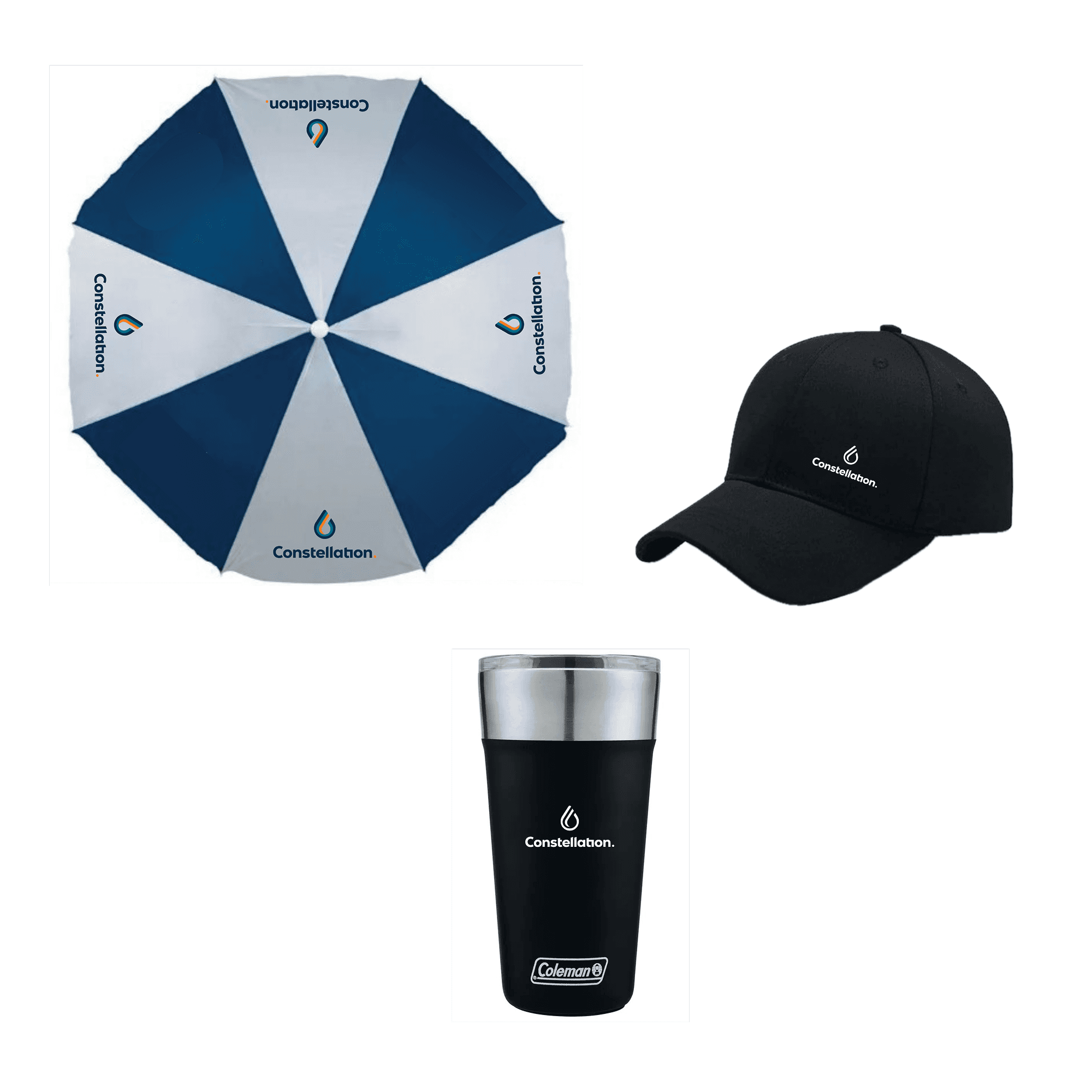 The kit consists of a Premium Umbrella, a Coleman thermal mug with lid, and a customized cap.