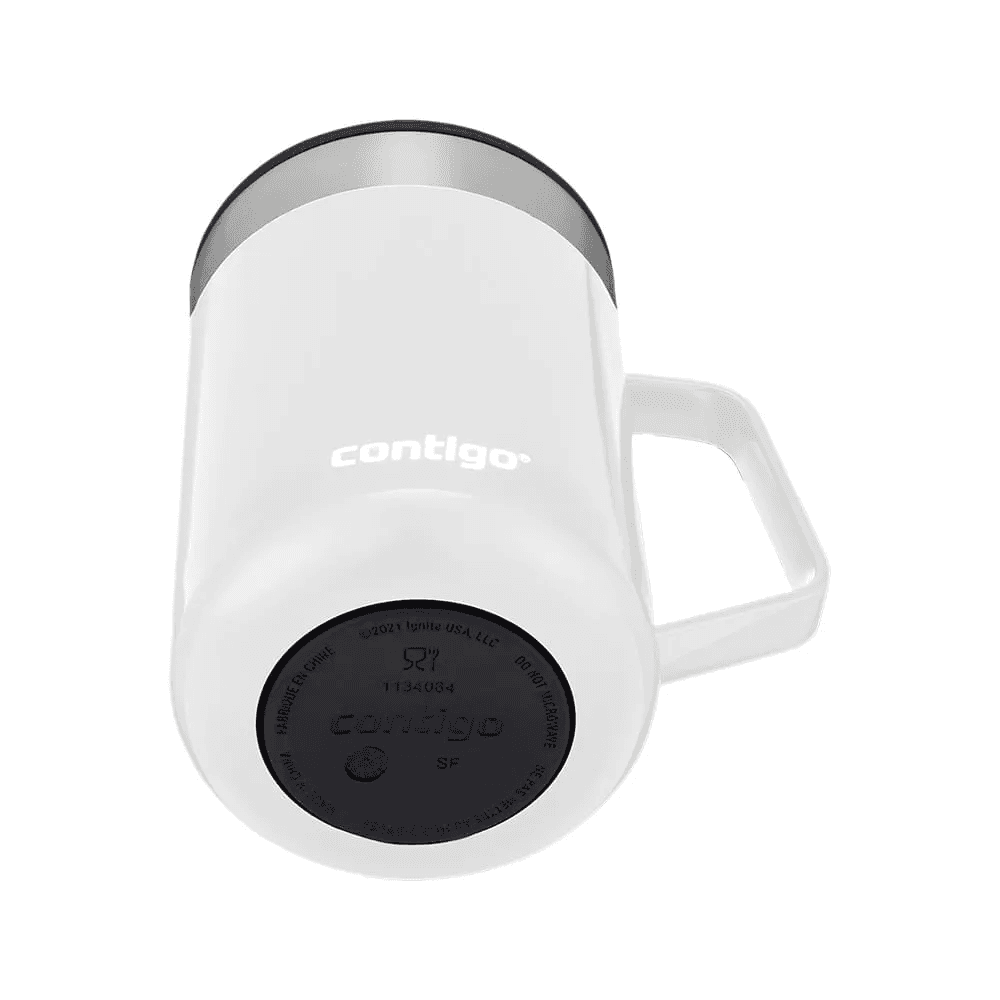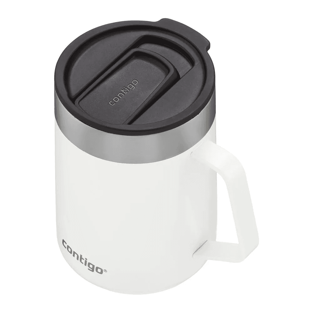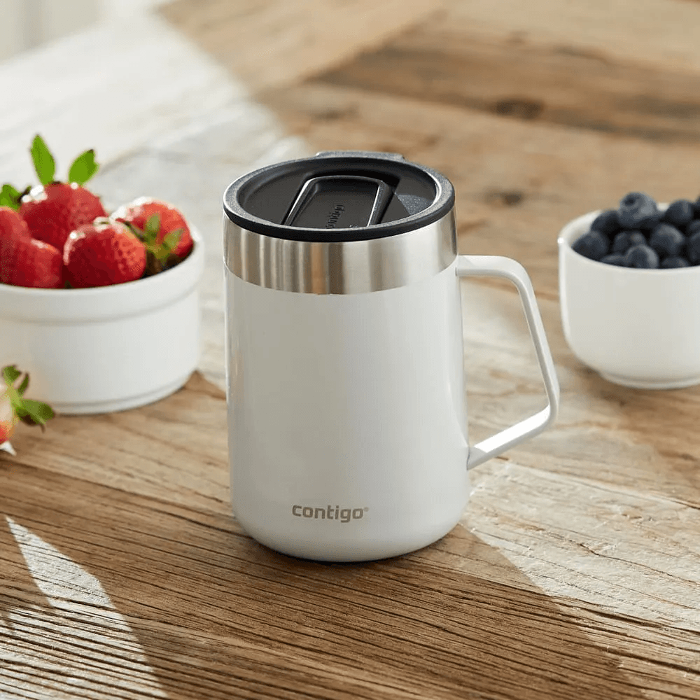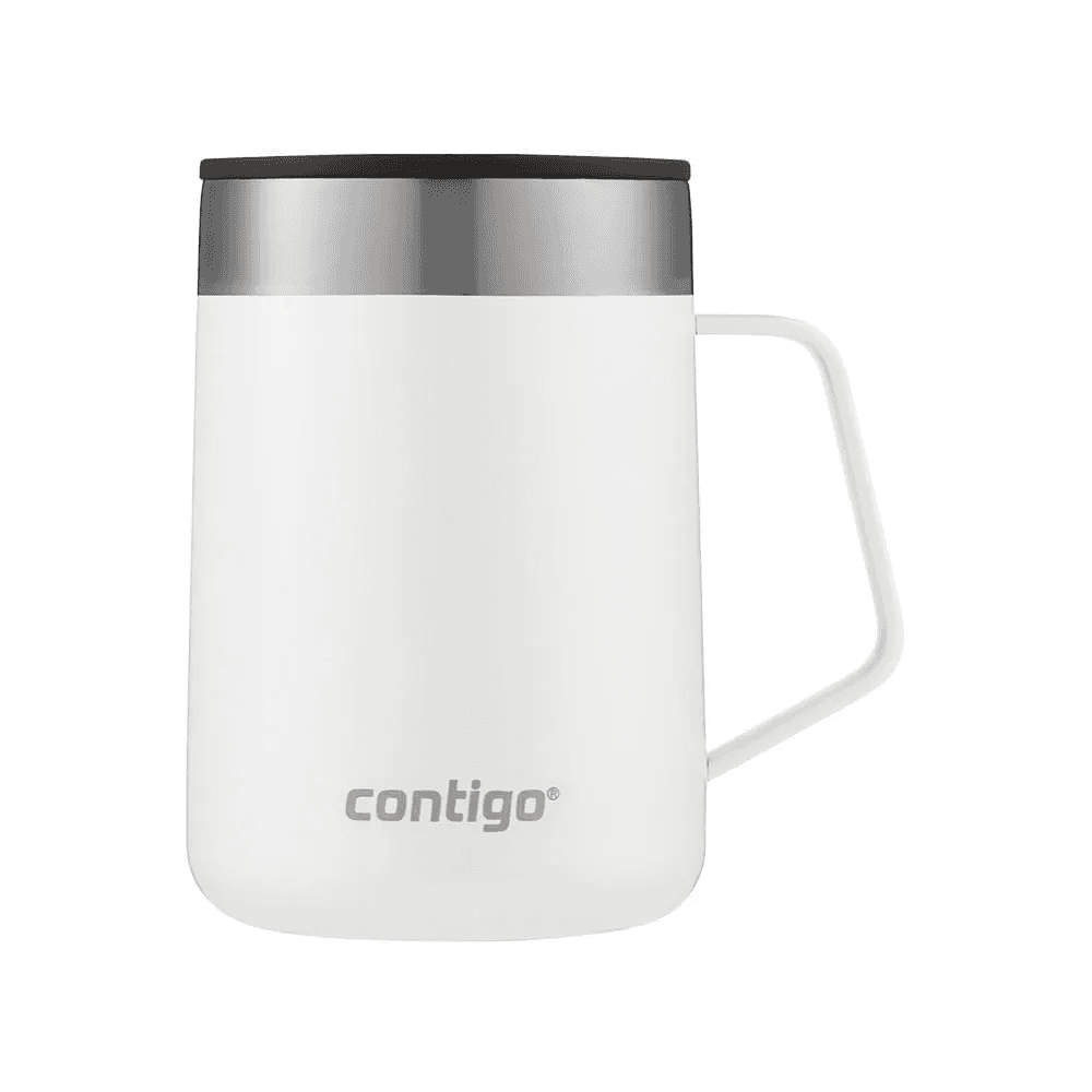 A Caneca Térmica Street Branca Contigo | 414ml, combina a praticidade de manter bebidas quentes ou frias por horas com um design sofisticado em cores metálicas chamativas. As bebidas permanecem quentes por até 5 horas ou frias por até 15 horas, perfeitas para tomar café enquanto trabalha em casa ou dá uma volta rápida pelo bairro. A alça confortável torna a hora de tomar suas bebidas favoritas mais agradável e a tampa à prova de respingos mantém sua bebida dentro da caneca quando fechada. O fundo emborrachado é antiderrapante e ajuda a evitar que a caneca escorregue, faça barulho ou risque as superfícies, para que você se sinta confiante ao colocá-la sobre qualquer superfície. A caneca cabe convenientemente na maioria das máquinas de café. Tanto o corpo quanto a tampa podem ir na prateleira superior da lava louças.