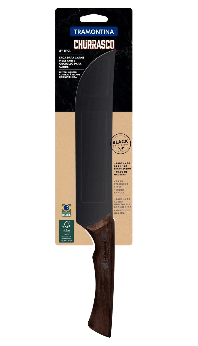 Se você você busca uma faca de alta qualidade e eficiênte para lhe auxiliar no corte do seu churrasco, a faca para carne Tramontina Churrasco Black com lâmina em aço inox escurecido e cabo de madeira 8 polegadas é essencial. Desenvolvida para os cortes mais diversos, tanto em carnes cruas, assadas ou cozidas, ela tem lâmina rígida com ponta curvada e é produzida em aço inox escurecido. Seu cabo é de madeira e possui rebites que além de um manuseio mais confortável, lhe proporcionam mais estilo e durabilidade. Garanta já a sua e deixe o preparo do seu churrasco muito mais prático!