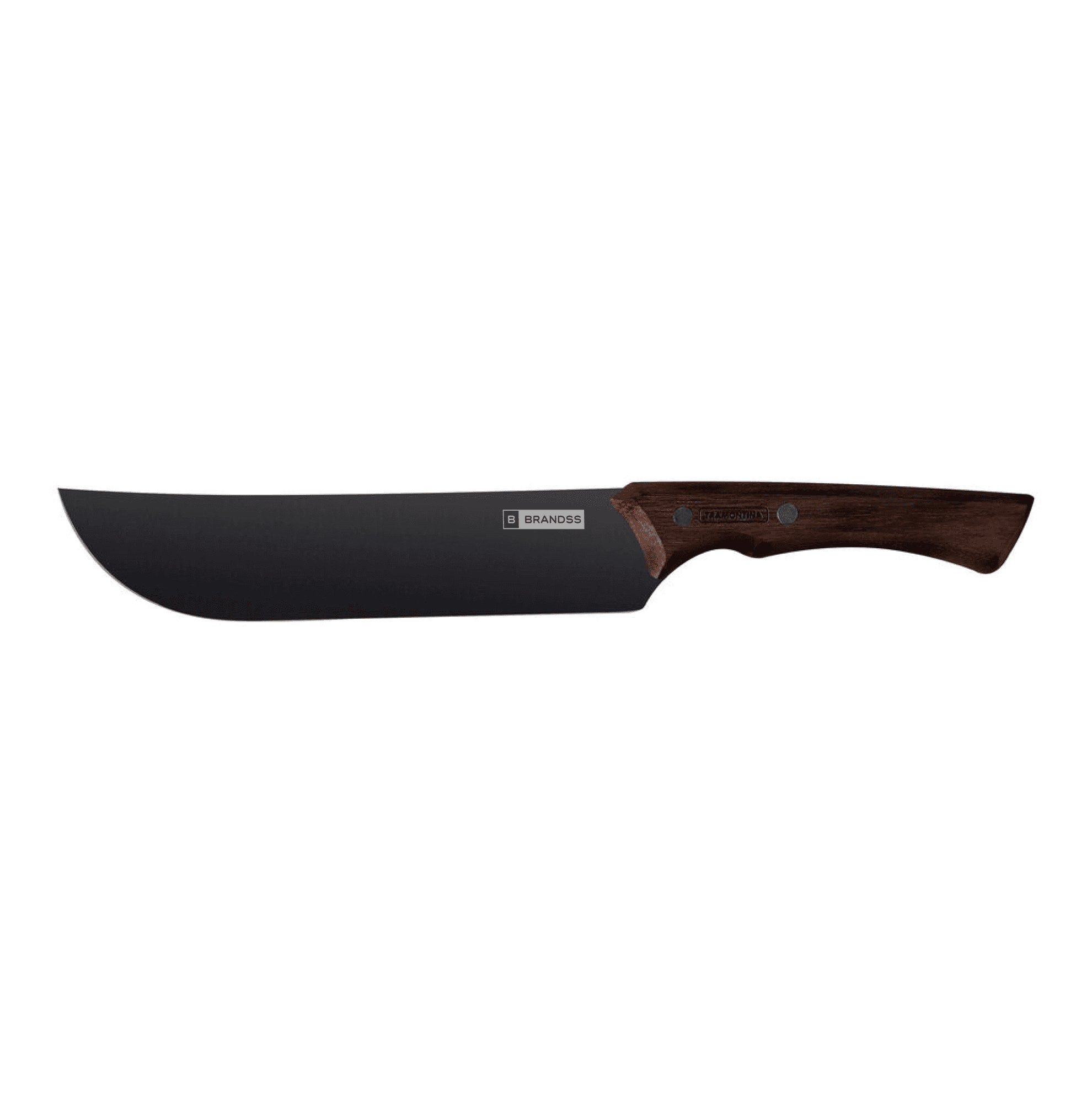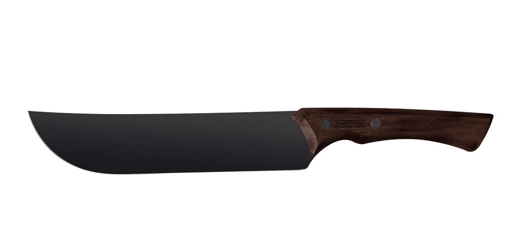 Lâmina de aço inox escurecido. Resistente e robusta.