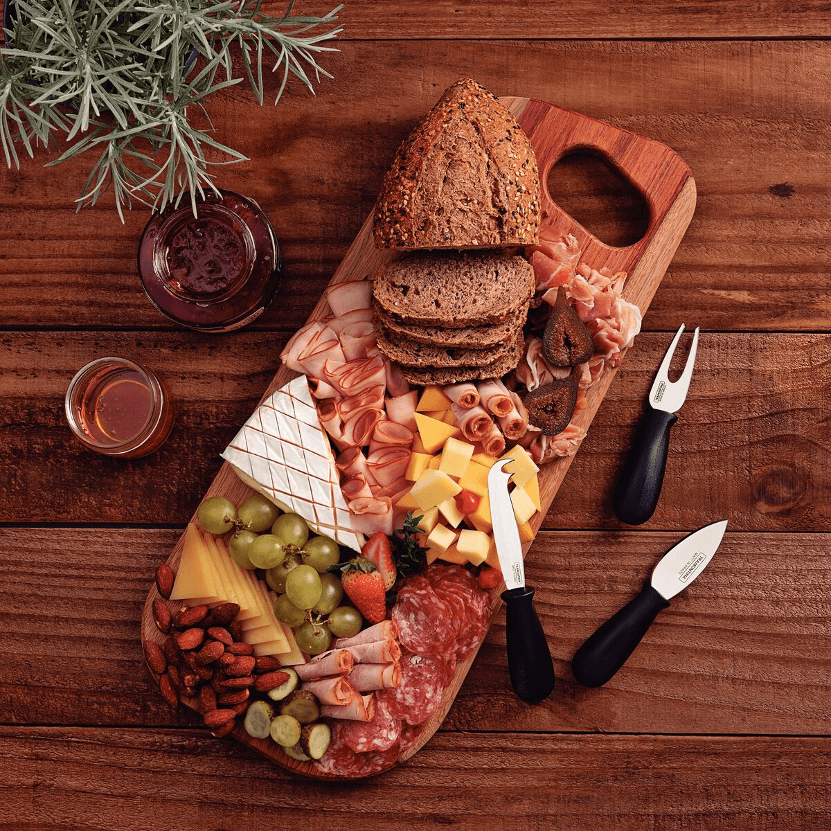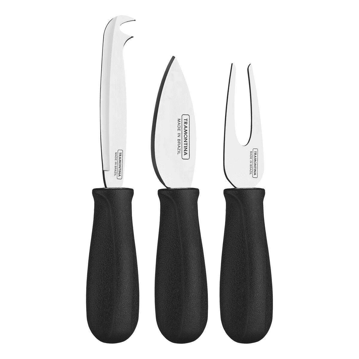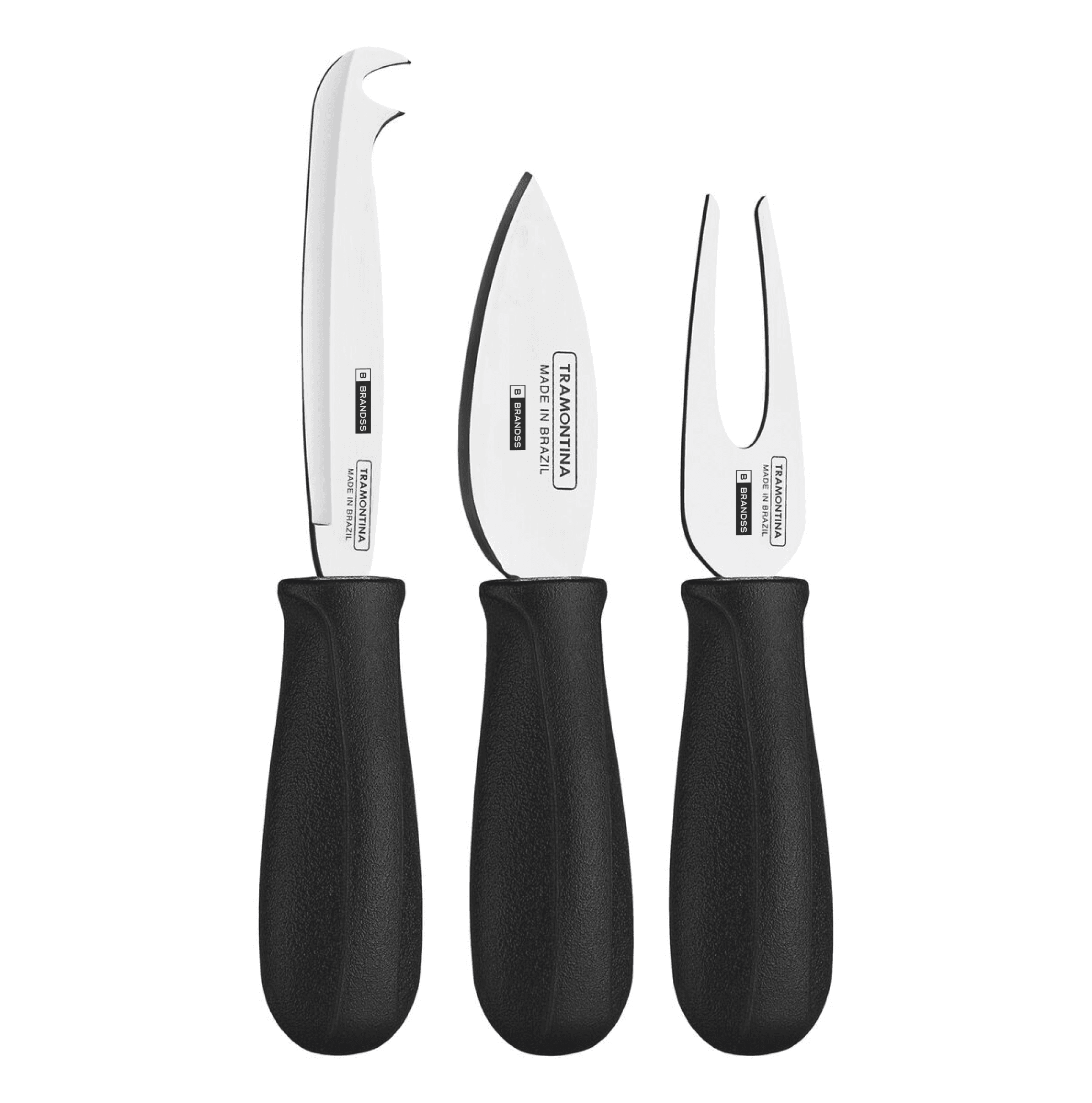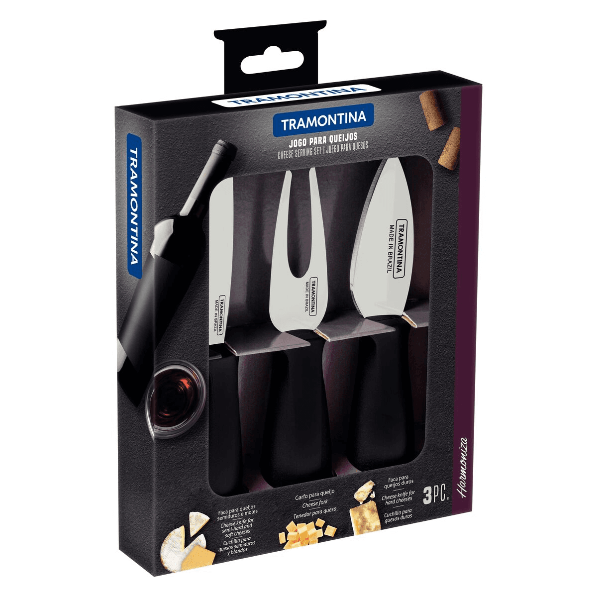 Um bom queijo pode dar requinte e muito sabor a várias situações. Por isso, aproveite o jogo para queijos Tramontina Harmoniza com lâminas em aço inox e cabos de polipropileno preto 3 peças. Com ele você terá um garfo e duas facas para queijos duros, semi duros e moles, e conta com lâminas de aço inox com alta durabilidade do fio, devido ao tratamento térmico. Os cabos são de polipropileno, o que os torna altamente resistentes, além de poderem ir à máquina de lavar louças. Um jogo que irá transformar a sua casa num lugar muito mais especial!
