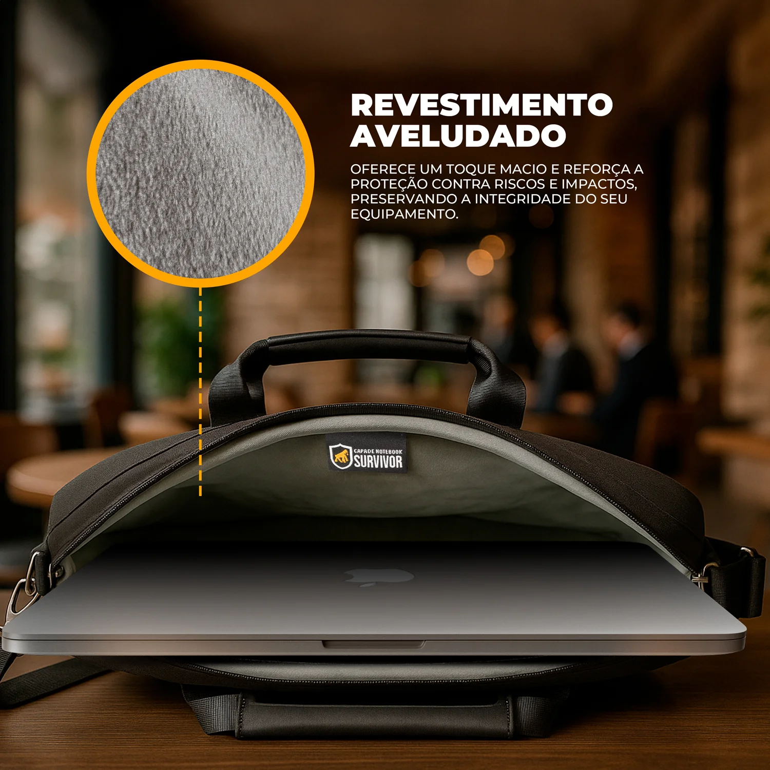 Sua estrutura externa é confeccionada em nylon poliuretano balístico, um material altamente resistente à água que ajuda a proteger contra respingos, umidade e sujeira do ambiente, mantendo o interior da capa sempre seco. Já a parte interna conta com revestimento aveludado, que oferece um toque macio e reforça a proteção contra riscos e impactos, preservando a integridade do seu equipamento. A Capa Office também conta com enchimento estratégico que atua como barreira contra batidas leves, tornando-se uma aliada indispensável em deslocamentos frequentes.